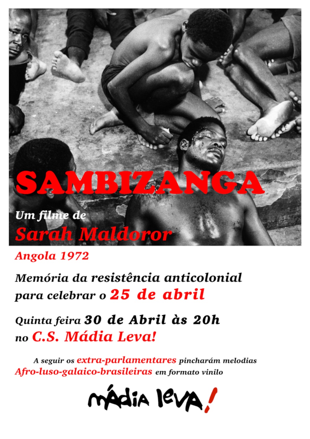 Mais um ano o Cineclube Mádia Leva! celebramos a revoluçom portuguesa resgatando um filme de entre a extensa filmografia que tem abordado o levantamento militar contra o regime fascista português e a subsequente insurreiçom popular e revolucionária que lhe seguiu, assim como as luitas de libertaçom nacional das colónias africanas que abalárom o regime colonial até faze-lo cair. Obras construídas nas margens da indústria cinematográfica e divulgadas fora dos circuitos comerciais, bem porque nom se ajustam ao relato consagrado à maior glória da democracia formal portuguesa, que assiste impotente ao renovado ascenso do fascismo; bem porque a liberdade estética e narrativa dos filmes nom se acomoda aos estándares convencionais e normativos impostos pola indústria cinematográfica.